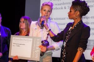 Het was daarnaast erg spannend, met de prijsuitreiking voor kapsalon van het jaar – hoogste sponsorbedrag. Minke van der weg ging met Haar´Salon uit Westergeest ging aan de haal met de eerste prijs. Zij ontvingen naast de prachtige beker een haartransplantatie van de Eberson Hair Clinic, t.w.v. €4.000,-. Op onderstaande foto ziet dat Sylvana Simons de prijs uitreikt. Op plek 2 eindigde Team Kapsalon Almere Haven, gevolgd door kapsalon Oog voor haar, uit Naaldwijk.